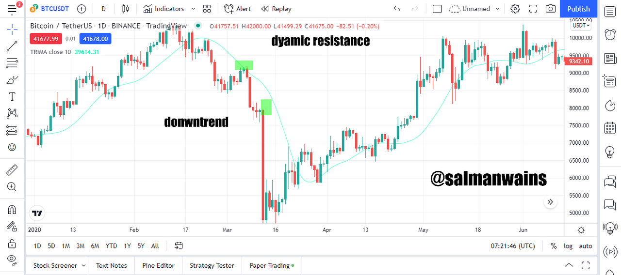 In the downtrend as shown in the BTC/USDT chart below the TRIMA line moves above the price action and acts as a dynamic resistance.