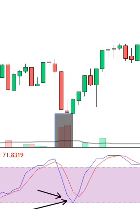 The stochastic indicator is part of oscillator indicators such as the RSI and the Commodity Channel Index (CCI). It shows the value between 0-100 according to the volume. Volume density sales are close to 0, volume density purchases are close to 100 with green candles.