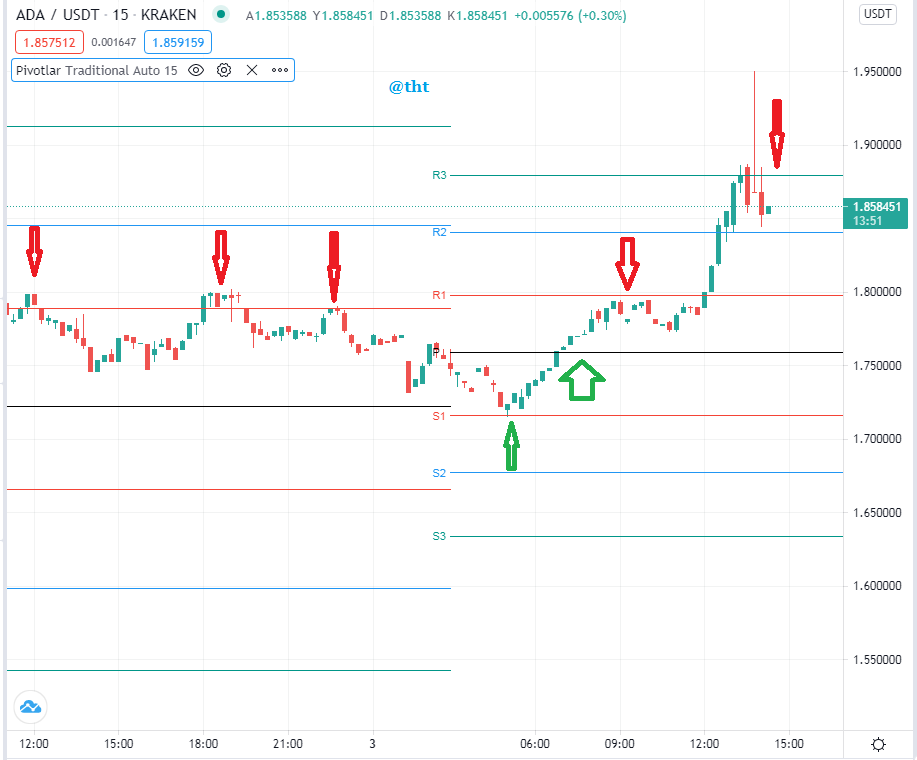 We can see that the ADA price is respecting the R1, S1 and R1,R2, R3 levels. This is especially evident in the chart on the first day. We may be wrong on the chart during periods of strong buying/selling. To avoid this situation, we should use Stoploss.