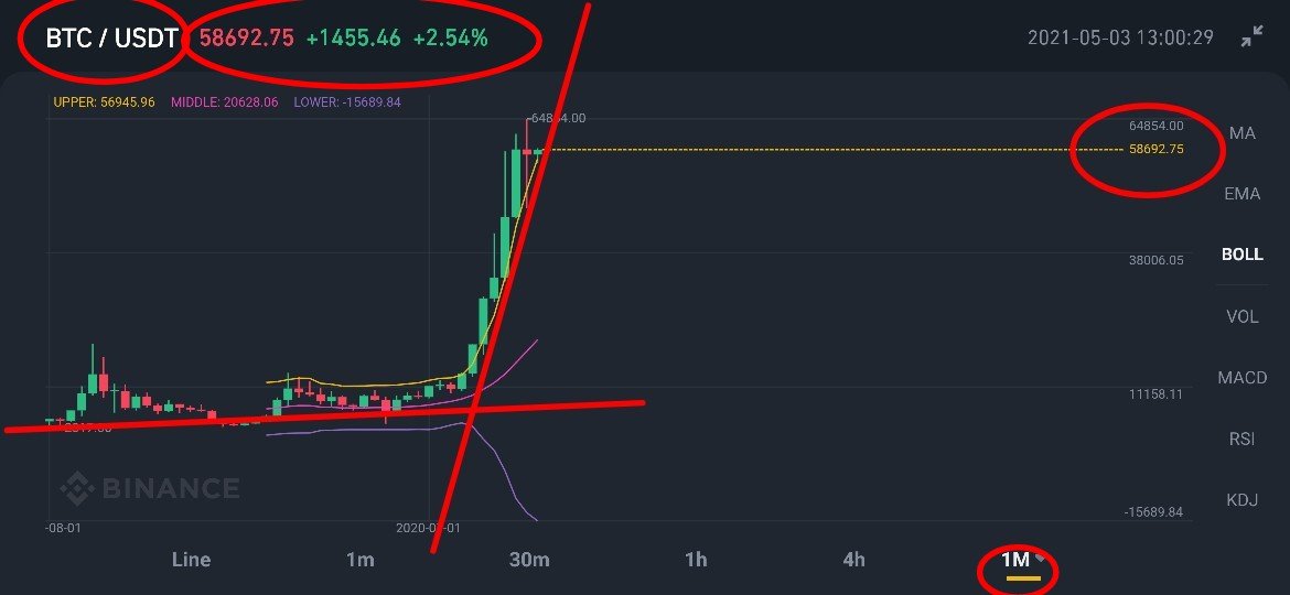 It's is so obvious that steep Uptrend from the charts. This was one weeks chart for the BTC/USDT which if any investor who made an entry when it was beerish should already be smiling with the uptrends seen with market price valued at $58,719.99 against the $48k seen previously.