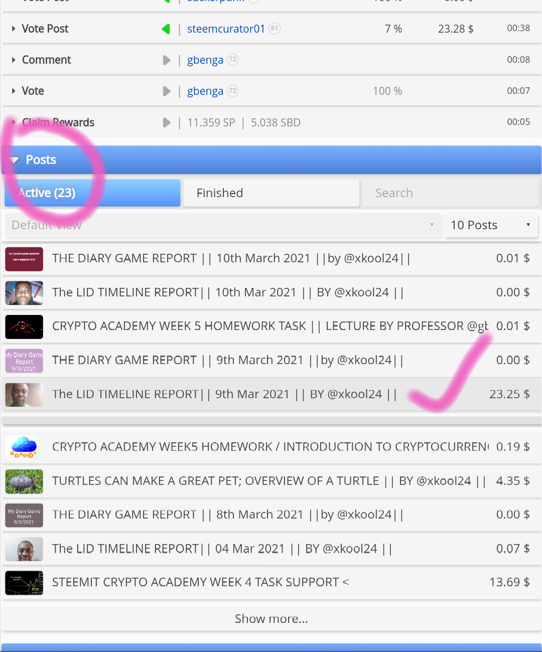 As soon as you click on the selected post, you can a drop down with a detailed specification on how the post account looks like. In this specification is also the Returned rewards as indicated in above image.