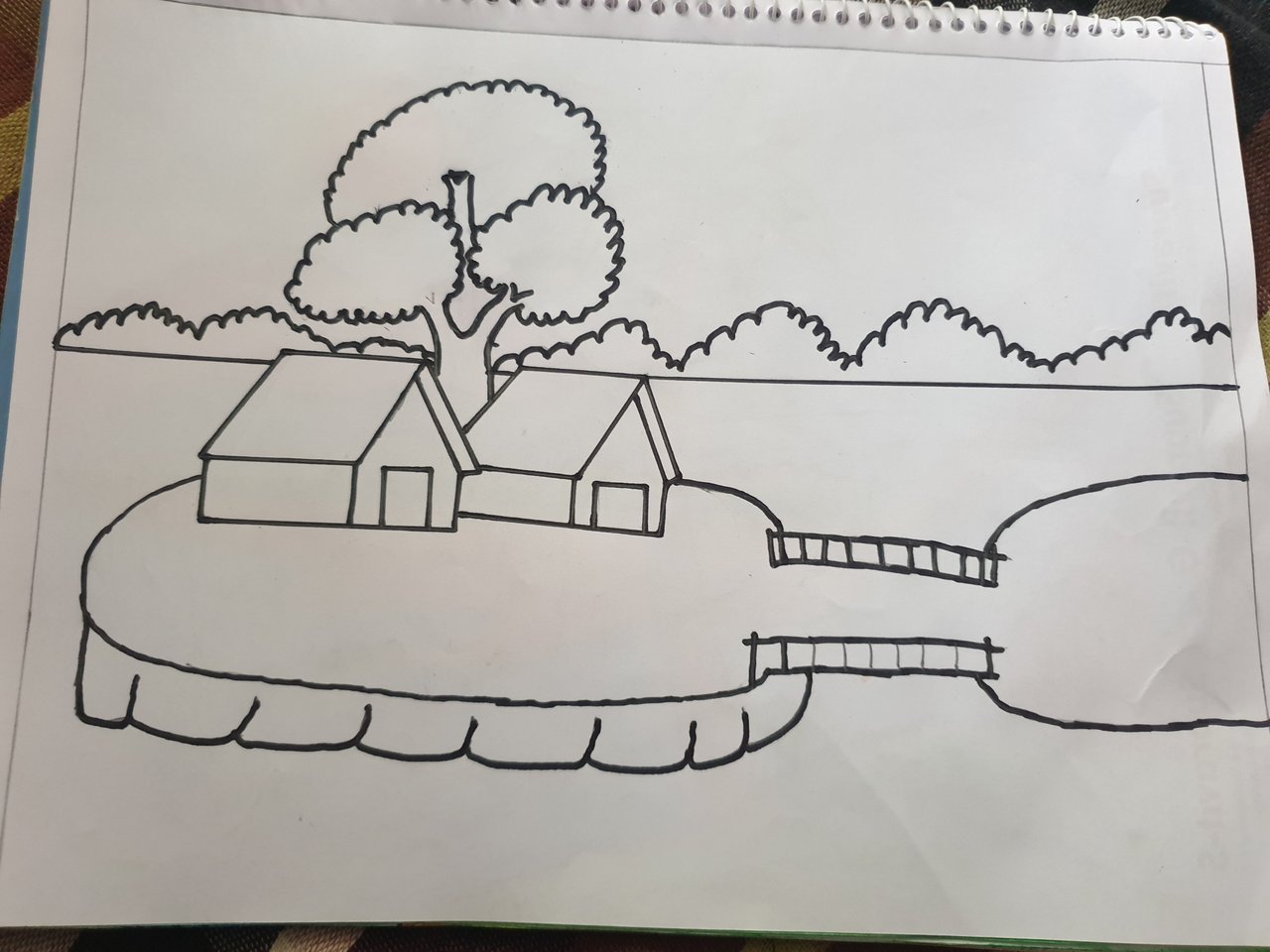 Draw the line again at the bottom of the circular line on either side of the two houses previously drawn. Which can be identified by the river bank. Simultaneously draw some part of a tree behind two houses.