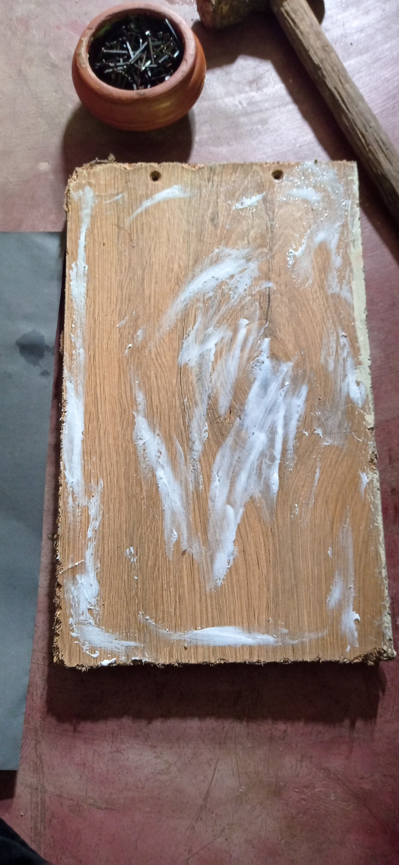 I first put gum on top of a piece of wood. Then I put a color paper on it and attached it. Then I put a pair around the inside with gum.