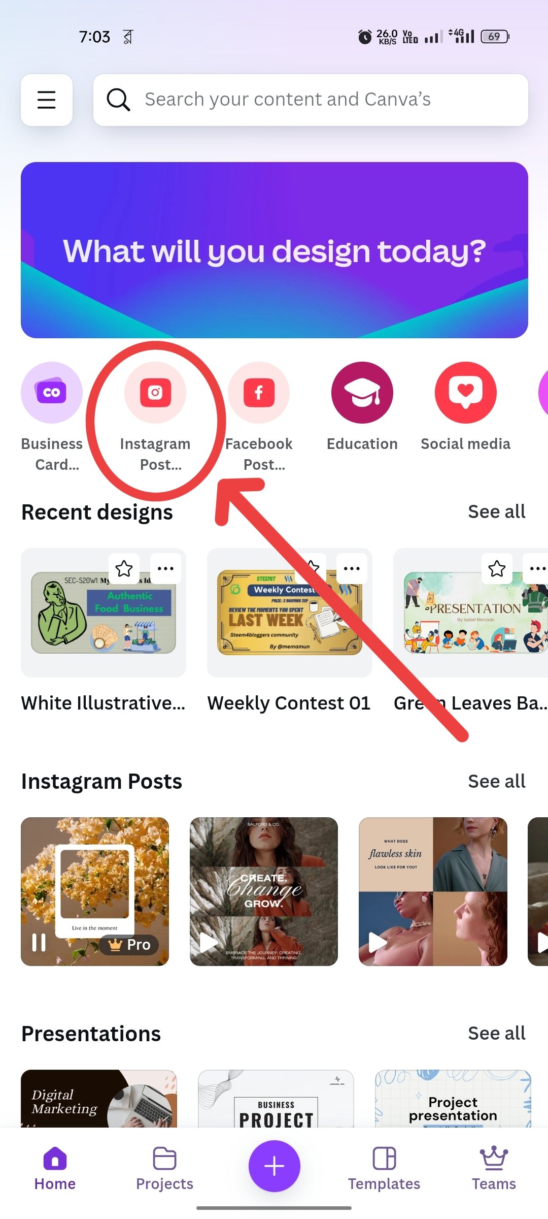 First I open the Canva app from my phone. The page that came first. From there I don't have to click anywhere. You can see in the next picture I clicked from Instagram crop. Then one such design is done. whose size is 1080×1080 px..