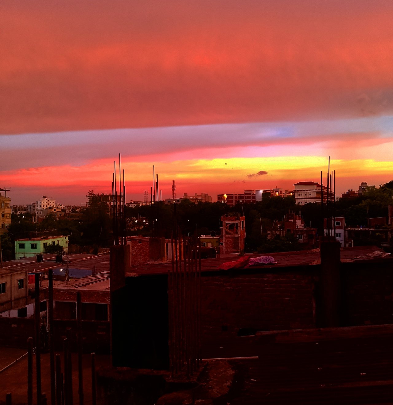 Such a crimson sky is rarely seen. The sky looks like it's on fire. The sky was like this that day too. I came to my room, opened the window, and stared in amazement at such a sky.