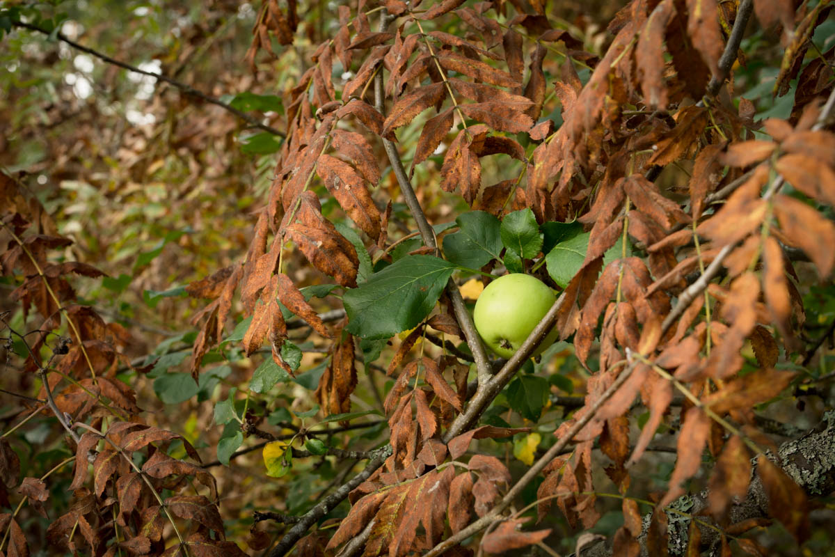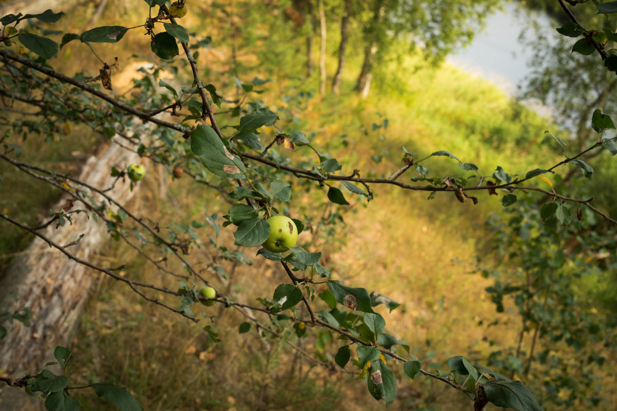 Не удивляйтесь этим яблокам, они растут прямо в лесу на берегу. Это должно быть дикая яблоня, но у неё вкусные яблоки. Обычно такого не случается. И если в этом году яблони моей мамы были без урожая, то на этой яблоне очень много плодов. Они чуть-чуть вяжут на вкус, но это не помешало мне вдоволь наесться и ещё принести домой.