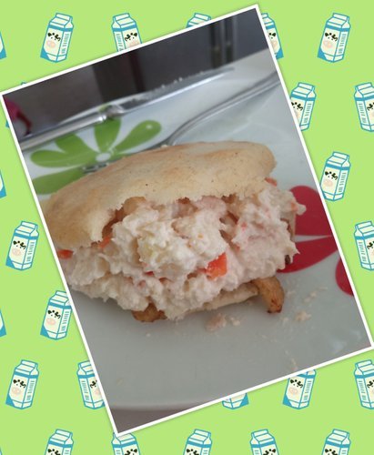 Mi desayuno: arepa con ensalada de pollo, plátano, queso y café.