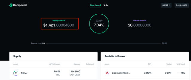 After that, you will see your balance and real-time interest earned in your Compound dashboard
