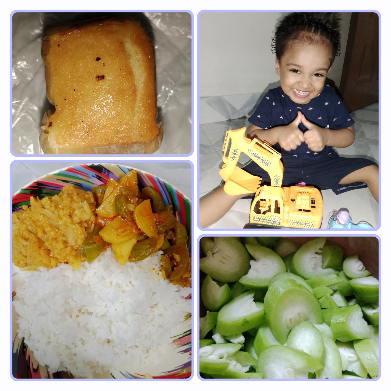 রাতে ঠিক মতন ঘুম না হওয়ার কারণে সকাল সকাল ঘুমিয়ে পড়ি এবং সেই ঘুম থেকে সকাল সাড়ে দশটার সময় উঠি। ওঠে হাতমুখ ধুয়ে এক গ্লাস পানি খাই, আমি ওঠার কিছুক্ষণ বাদেই ছেলে উঠে যায়। এরপর ছেলেকে হাতমুখ ধুয়ে এনে এক পিস কেক খাইয়ে দি। ছেলে কেক পিস খেয়ে ফোন দিয়ে কাটুন দেখতে লাগল আর আমি এদিকে রান্না ঘরে চলে গেলাম।