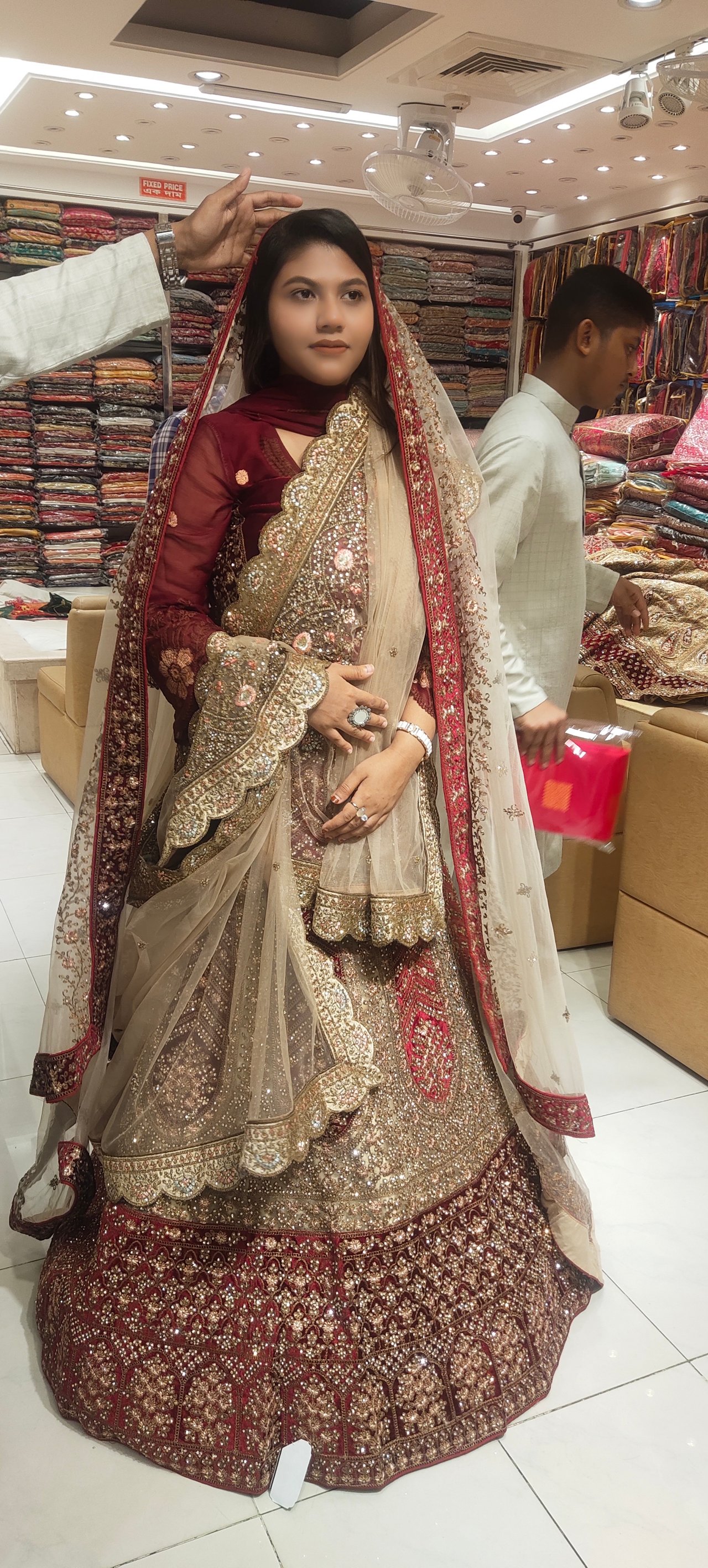 পরবর্তীতে বউয়ের পছন্দ কিছুটা পরিবর্তন হলো।বলে রাখি আজকে কেনাকাটায় বিয়ের কনে, তার দুই ভাবি,আমি,বরের মা,বরের খালা ও বরের ভাইসহ মোট আট জন গিয়েছিলাম। প্রথম একটি দোকানে ঢুকে অনেকগুলো লেহেঙ্গা দেখলাম। প্রথম লেহেঙ্গার দাম চাইলো ৪৬ হাজার পরের টা ৩২ হাজার।অত:পর সেখান থেকে আরেকটি দোকানে গেলাম।এই দোকানদার বউয়ের ভাবির পরিচিত।
