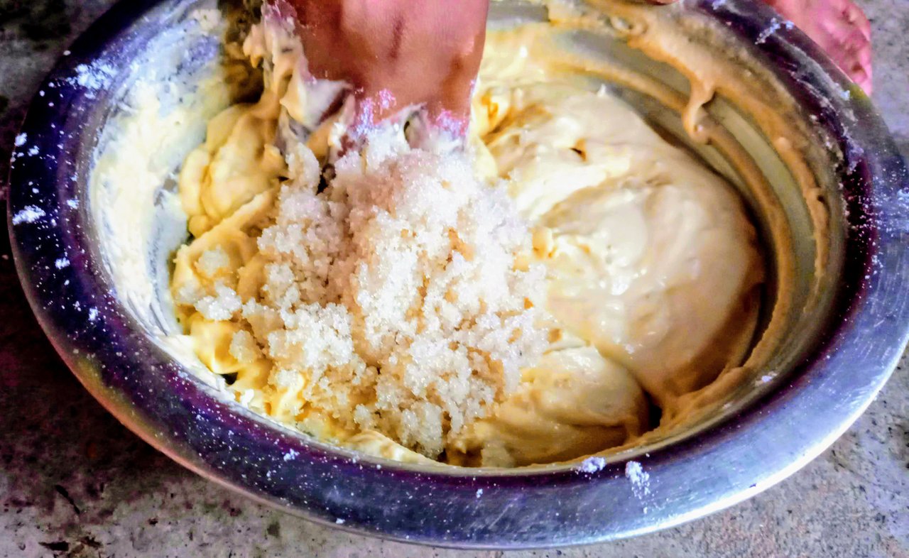 মোটামুটি ভাবে তালের রস ও চাউলের আটা মিশিয়ে , মিশ্রণটিতে এবার প্রয়োজনীয় পরিমান চিনি মেশানো হবে। চিনি দেওয়া হচ্ছে। সবকিছু ঠিকঠাক ভাবে মিশানো হলে প্রয়োজনীয় পরিমাণ রস কিংবা পানি মিশিয়ে মিশ্রণটিকে সম্পূর্ণ পিঠা তৈরির উপযোগী করে গোলা তৈরি নেওয়া হবে ।