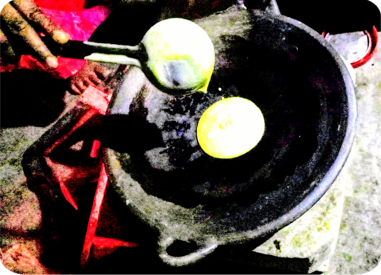 সিমেন্টের চুলায় আগুন জ্বালিয়ে, তাতে মাটির খোলা বসিয়ে দেওয়া হয়েছে এখন তার পিঠা তৈরি জন্য আগে থেকে করে নেওয়া গোলাগুলো চামুচের সাহায্যে উত্তপ্ত মাটির খোলায় দিয়ে দিয়ে পিঠা ভেজে নিব এখন একটি পিঠা ভাজার জন্য খোলায় গোলা দেওয়া হচ্ছে