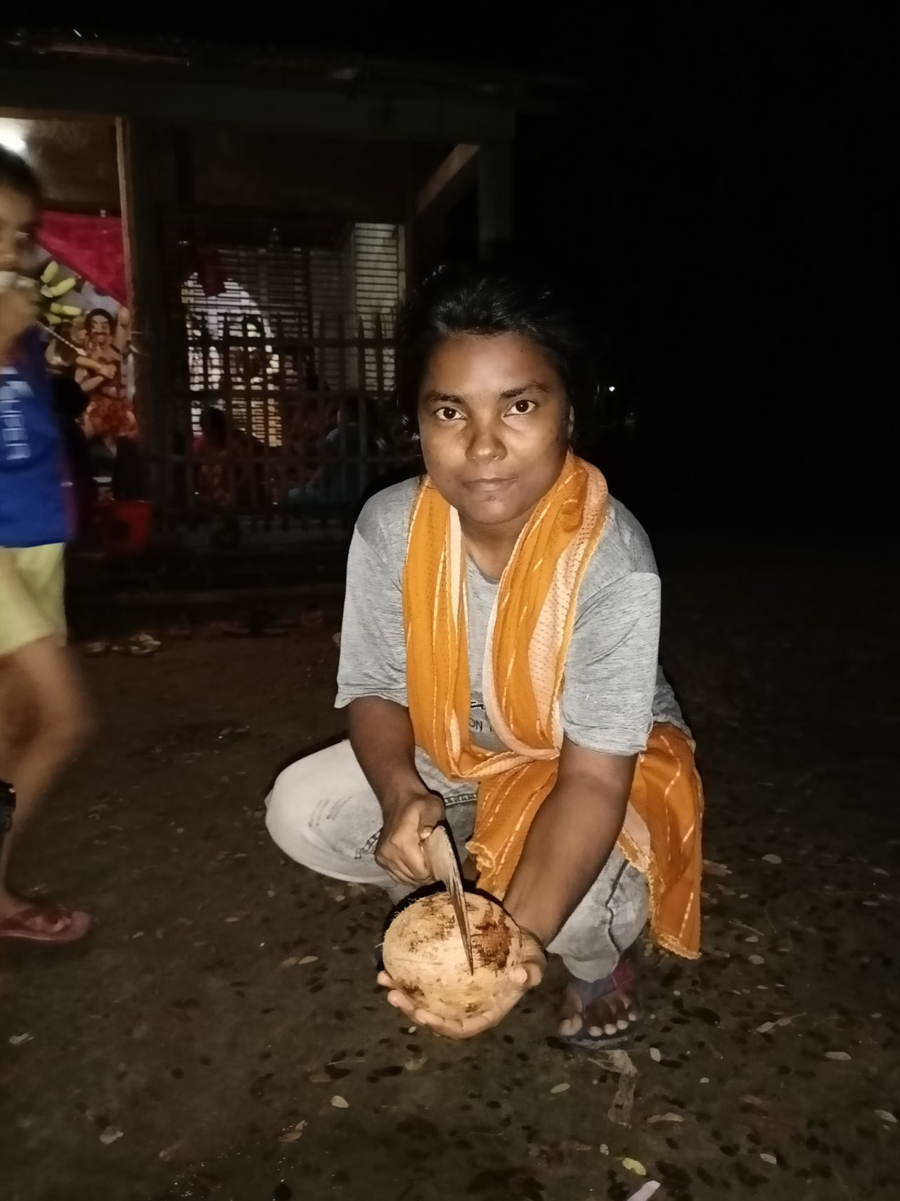 আমি নারকেল ভাঙ্গার কাজে সহযোগিতা করেছিলাম। তখন প্রায় রাত দশ'টা। যথেষ্ট রাত হয়েছিল। তবে অনেক কাজ, আমি বুঝতে পারলাম যে সম্পূর্ণ রাত লাগবে সব কাজ শেষ করতে। কারণ বিশ কেজি ময়দার লুচি, তারপর এতো গুলো নারকেলের নাড়ু।