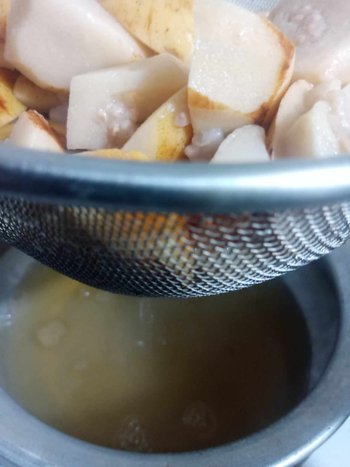 এরপরে একটা চালুনিতে ঢেলে পেয়ারার ছেকে নিতে হবে। এখানে আমাদের ছেকে নেয়া এই রস টুকুই লাগবে। এবার রস গুলো কাপ দিয়ে মেপে নিতে হবে।কারন। এক কাপ রসের জন্য ৩/৪ কাপ চিনি নিতে হবে।