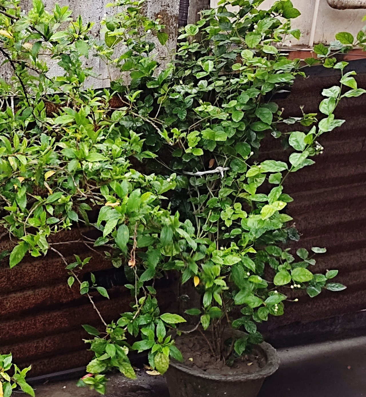 জবা ফুলের গা ঘেঁষে রাখা হয়েছে বেল ফুলের গাছটি। যেটা একদম ঘরের দরজার সামনে রেখেছি। রাতের বেলায় এই বেল ফুলের গন্ধ সারা ঘরে ছড়িয়ে পডলে, সে এক অন্যরকম ভালো লাগা। রাতের দিকে দরজা খুললেই ফুলগাছটা ফুলে সাদা হয়ে থাকে, আর তার সাথে ভেসে আসে সুগন্ধ। অবশ্য ফুল ফোটা শেষ হয়ে গেলে, এই টবটাকে আবার ছাদের অন্যদিকে রেখে দেওয়া হয়।