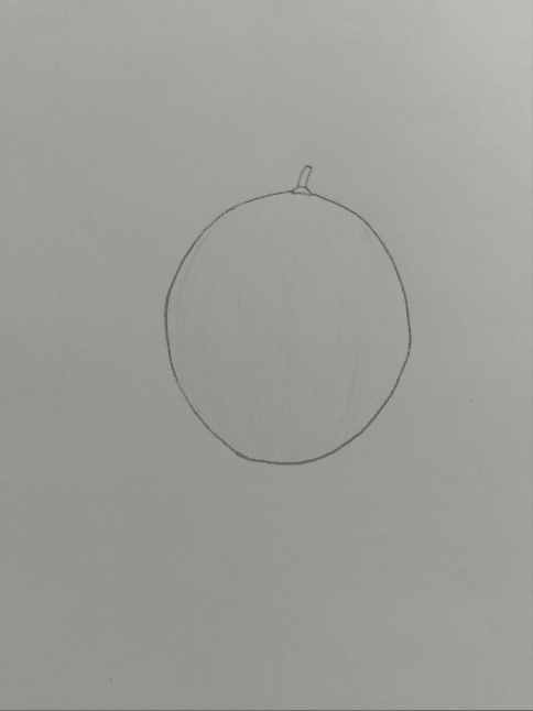 First, I gathered the necessary materials and then used a pencil to draw an outline of a watermelon on white paper. After that, I drew a line across the middle of the watermelon. Similarly, I added a few more lines on both sides of this middle line using a pencil.
