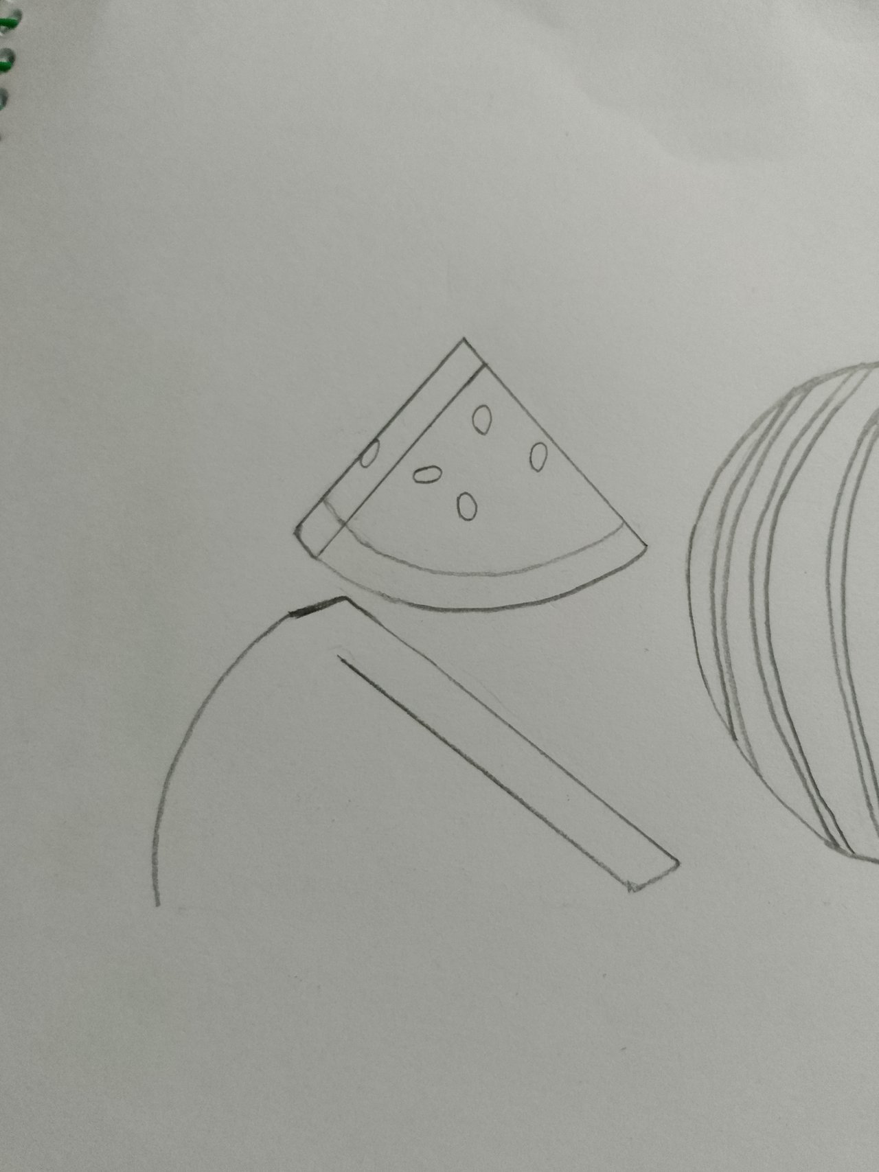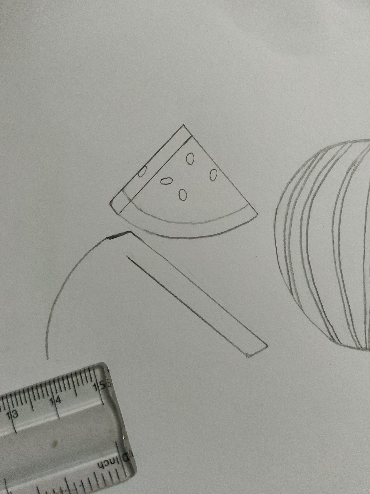 Now, I will draw a watermelon slice on the left side of the whole watermelon. To do this, I first drew a guideline using a ruler. Then, I created the outline of a watermelon slice. Once the slice was drawn, I added a few seeds inside the watermelon.