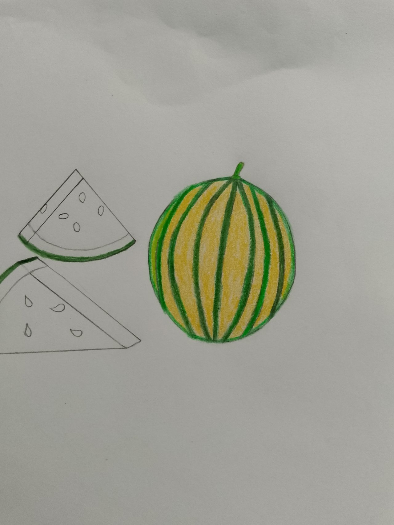 For coloring, I started with the whole watermelon. First, I colored the top stem part green. Then, I used dark green to color the lines that I had drawn on the watermelon earlier. After that, I applied dark green to the outline of the watermelon slices on the left side.
