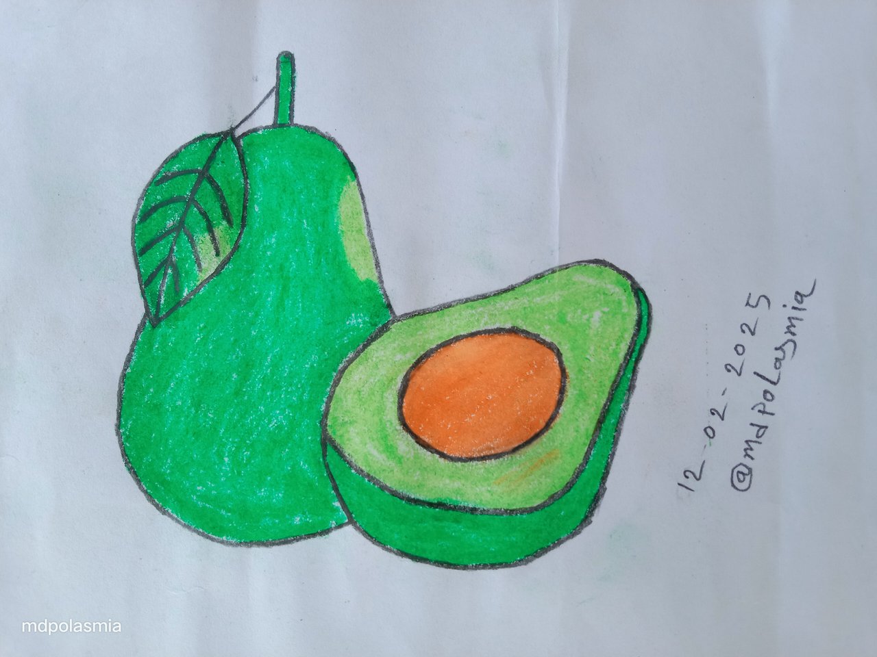 I first took all the art tools. Then I took A4 paper. Then I started to get tired. First I drew the leaves of the avocado fruit. Next I drew an avocado fruit. Then I moved to the second step.