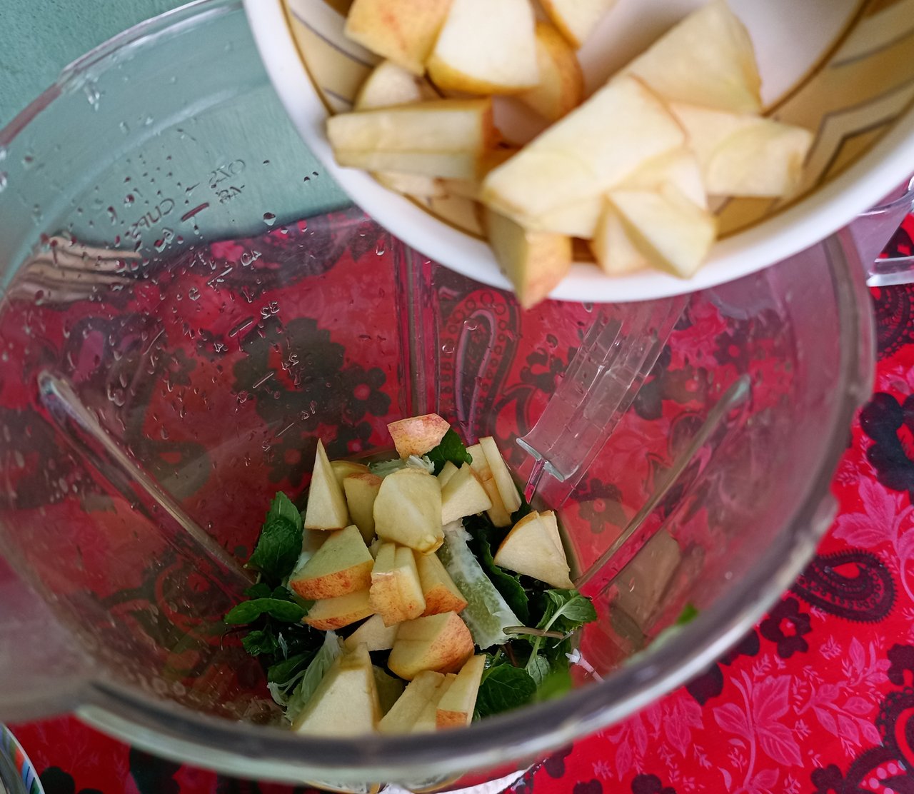 - এবার আমি সবগুলোকে ব্লান্ডার করে নেব। ব্লেন্ডার করার জন্য প্রথমে আমি ব্লেন্ডারের পাত্রে এক গ্লাস ঠান্ডা পানি ঢেলে নিলাম। তারপর আমি এক এক করে প্রথমে পুদিনা পাতা, লেবু, আপেলের টুকরো, চিনি, বিট লবণ ও জিরা গুড়া সবগুলো এর মধ্যে দিয়ে দিলাম।