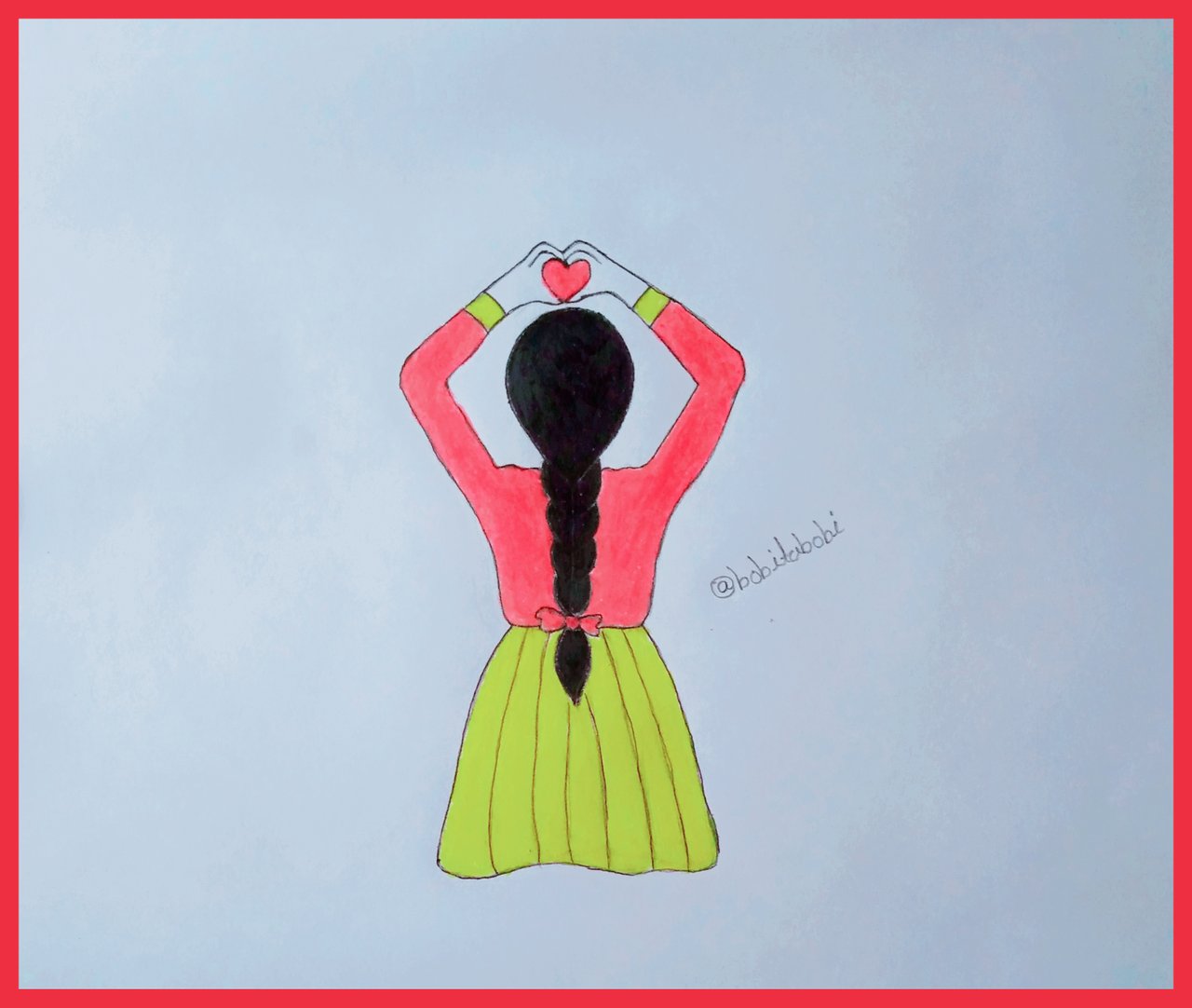 মেয়েটির মাথার উপরে সুন্দর একটি লাভ একে নেই। এরপর মেয়েটির বাম হাত ও ডান হাত চিত্রে দেখার মতো করে একে নেই।