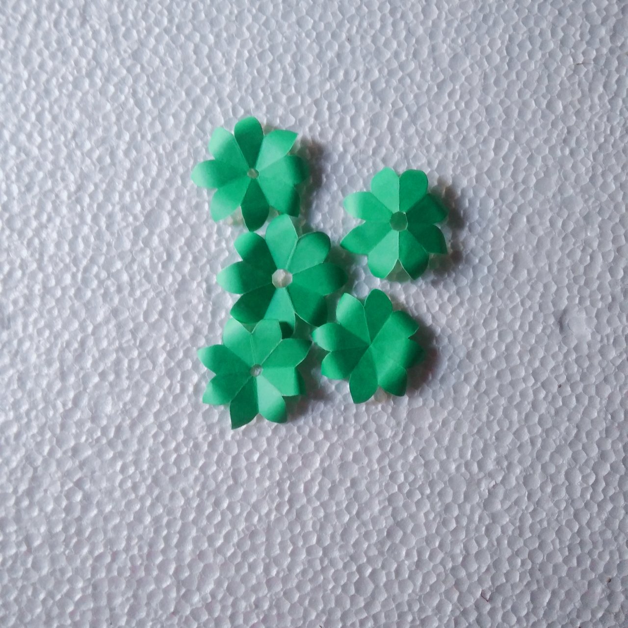 সবুজ কাগজের সাইজ ছোট করে কেটে নিয়ে ত্রিভুজ আকৃতির মতো ভাঁজ করে পেন্সিল দিয়ে পাতা একে নেই। এরপর কাঁচি দিয়ে কেটে পাঁচটি পাতা বানিয়ে নেই।