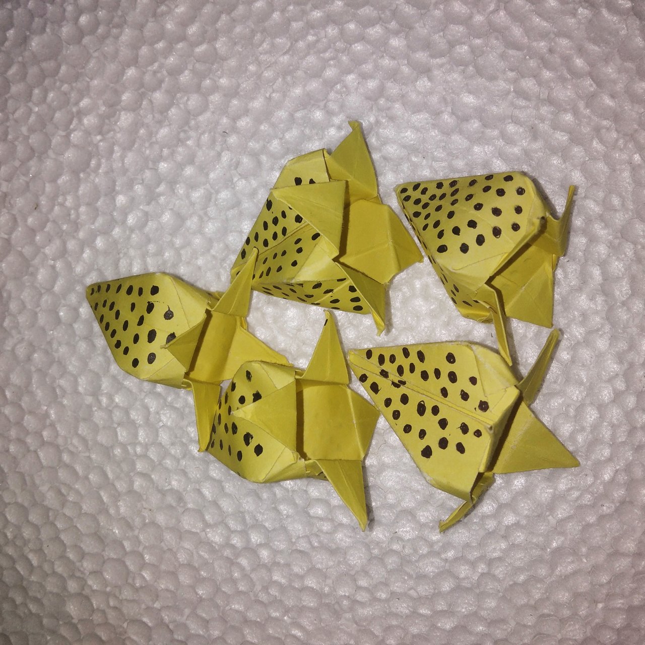 প্রথমে হলুদ কাগজের সাইজ ছোট করে কেটে নিয়ে ত্রিভুজ আকৃতির মতো ভাঁজ করে নেই। আবার মাঝ বরাবর ভাগ করে নিয়ে চিত্রের মতো করে নেই।