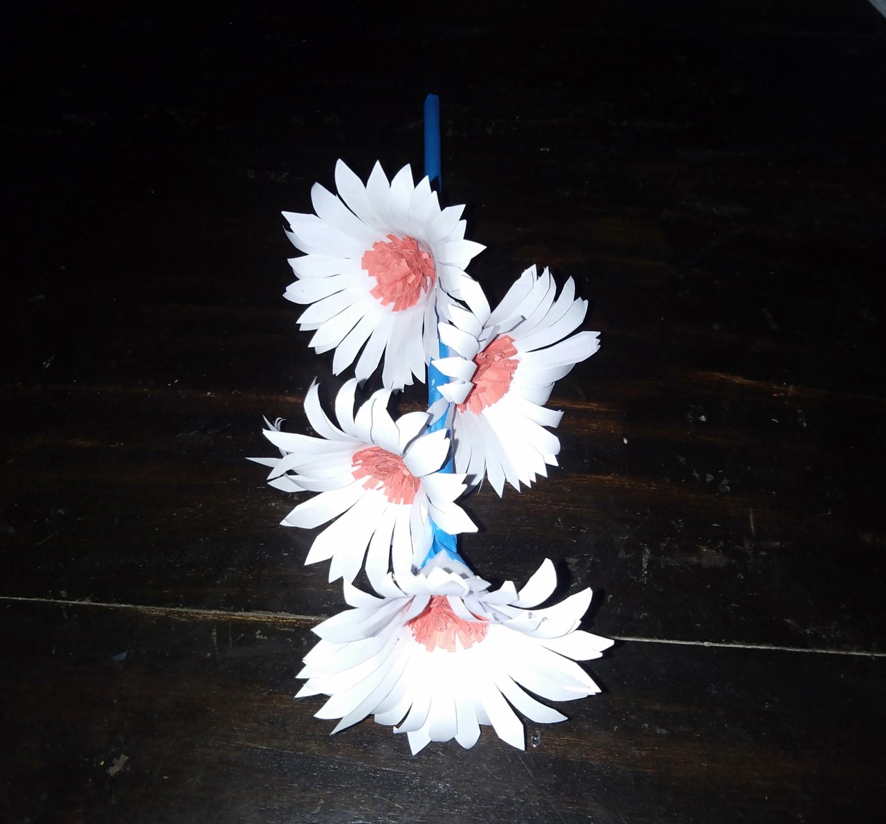 নীল কাগজের সাইজ লম্বা করে কেটে নিয়ে কাঠির সাহায্যে রোল বানিয়ে নেই। এরপর রোলের মধ্যে সাদা ফুল গুলো আঠা দিয়ে লাগিয়ে নেই।
