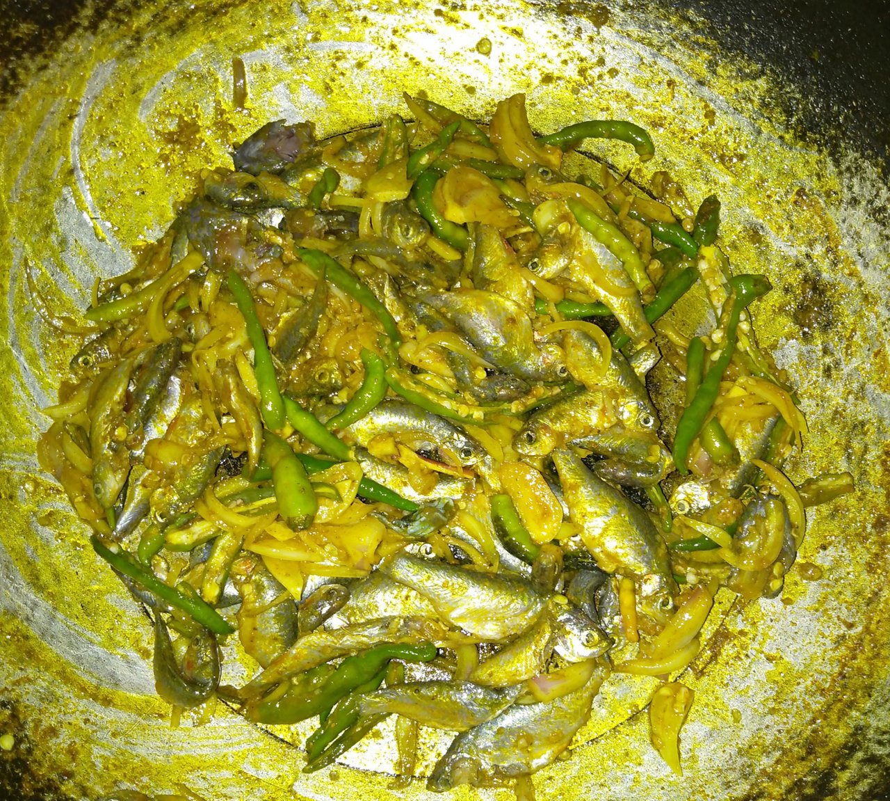 সব মসলা গুলো একটু পোড়া পোড়া করে নিয়ে ধুয়ে রাখা ছোট মাছ গুলো কড়াই এর মধ্যে দিয়ে নেই। এরপর ভালোভাবে নেড়ে দিয়ে কিছুক্ষণ রেখে দেই কষিয়ে নেওয়ার জন্য।