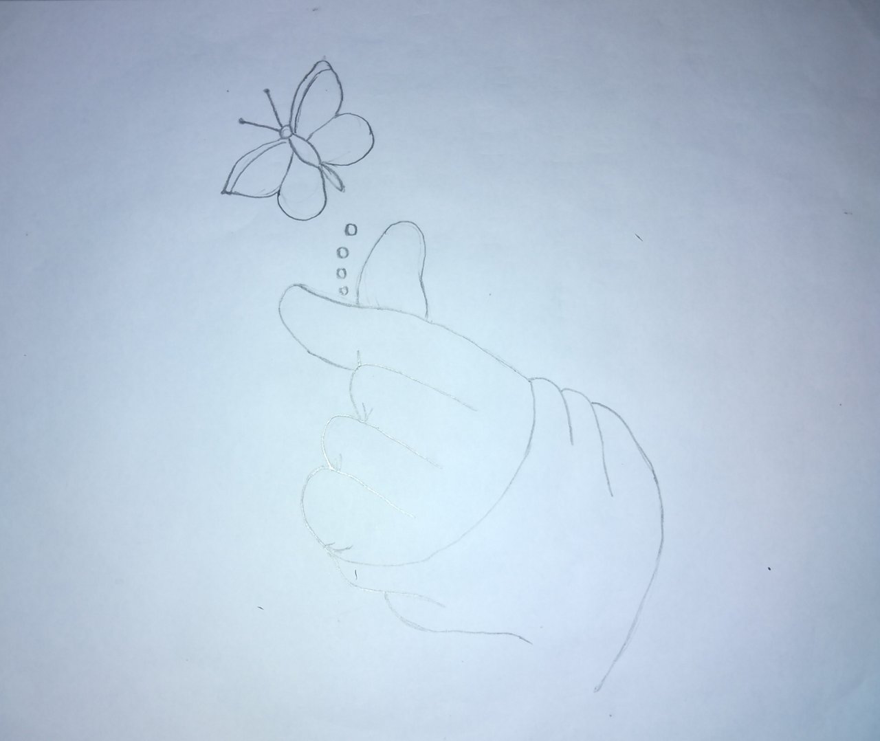 পেন্সিল দিয়ে সাদা কাগজের উপর প্রজাপতি একে নেই। এরপর হাতের আঙ্গুলের উপর চারটি ছোট বৃত্ত এঁকে নেই।