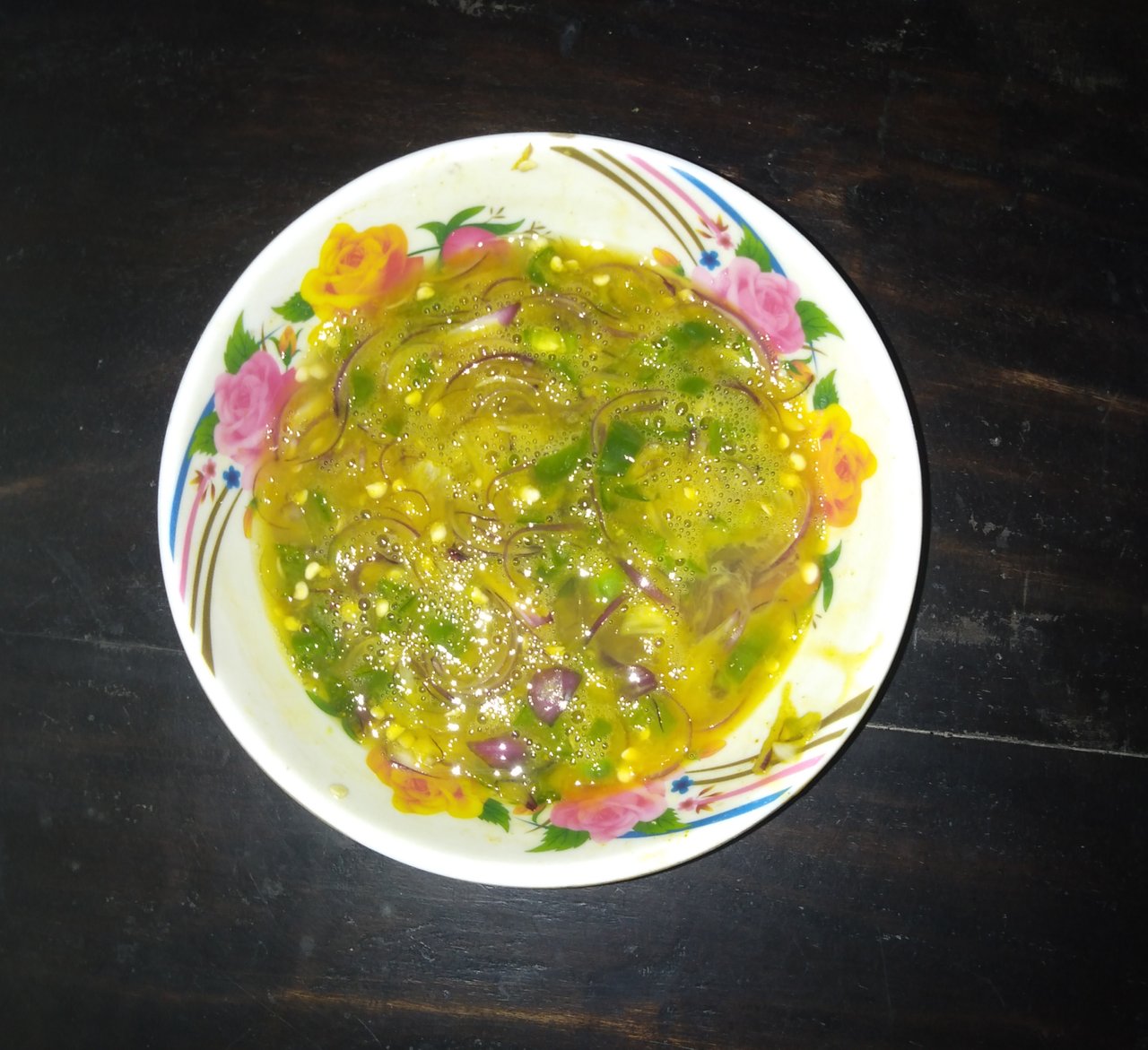 এরপর পেঁয়াজ এবং মরিচ গুলো কুঁচি কুঁচি করে নেই। এরপর একটি ডিম পাত্রের মধ্যে দিয়ে কাটা চামচ এর সাহায্য ভালো ভাবে মিশিয়ে নেই।