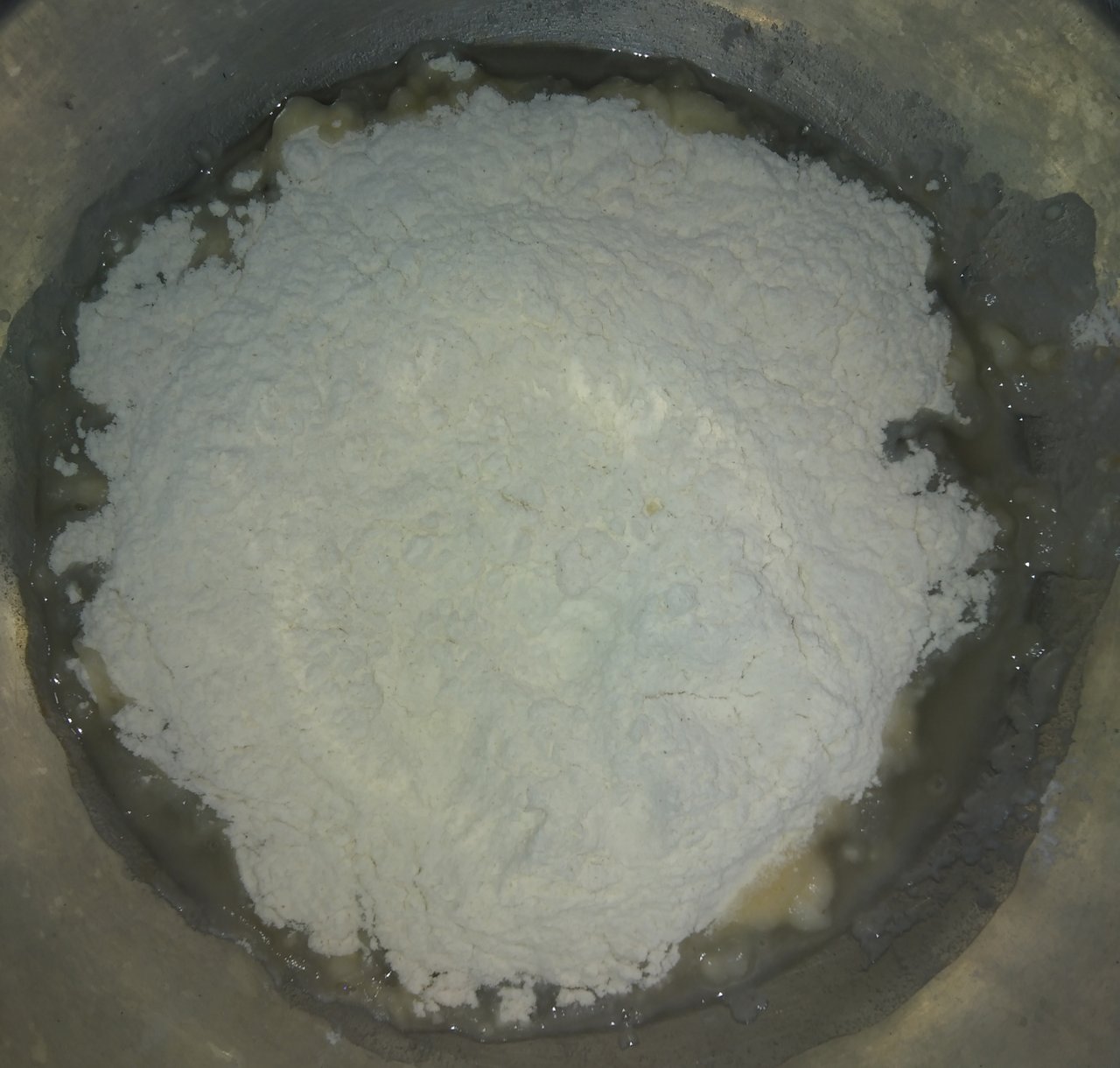 পানি গরম করে নেওয়ার পর পরিমাণ মতো আটা পাত্রের মধ্যে দিয়ে নেই। এরপর আটা গুলো হাতের সাহায্যে ছবিতে দেখার মতো করে গোল করে নেই।
