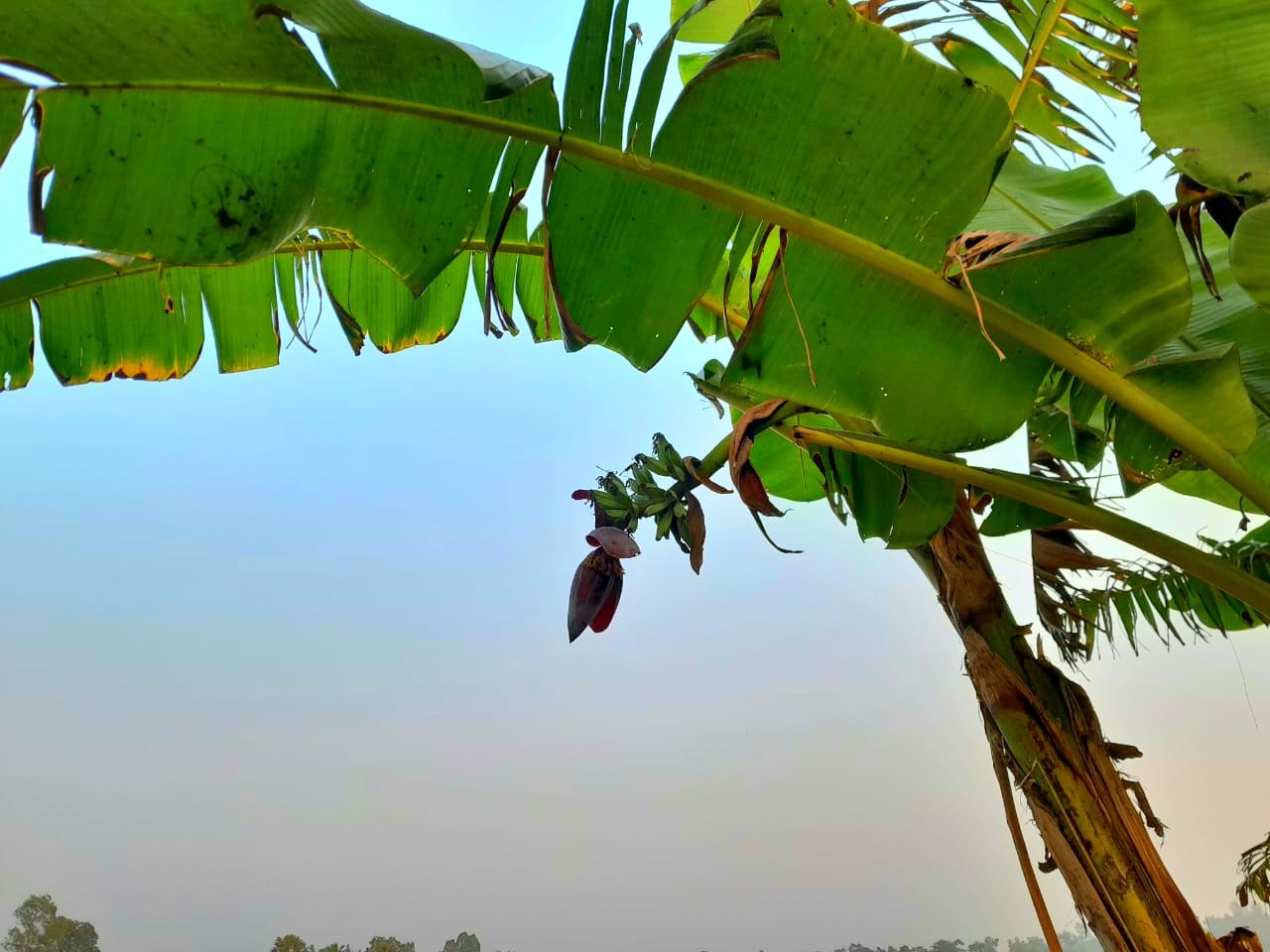 ছবিটিতে দেখা যাচ্ছে একটি কলার থোড় বের হয়ে আছে। এটি জমির পাশেই একটি গাছ। যেটা জমির মধ্যে দেখা যাচ্ছে। গাছটিতে একটা থোড় বের হয়েছে কিন্তু সম্পূর্ণভাবে কলার ছড়া বের হয়নি। দেখে আমার কাছে ভালো লেগেছিল। শুধুমাত্র একটি গাছের মধ্যেই দেখলাম। যদিও অনেকদিন পর দেখা তাই ছবি তুলে নিয়েছি, আর ভাবলাম আপনাদের সাথে শেয়ার করি। এটি খাওয়া যায় বিভিন্ন রকম ভাবে। রান্না করেও খাওয়া হয়, খেতে ভালোই লাগে।