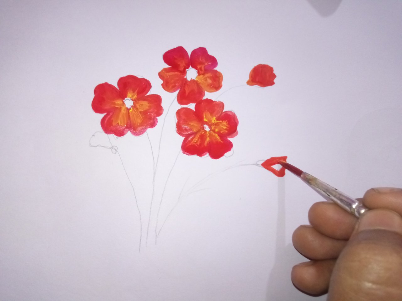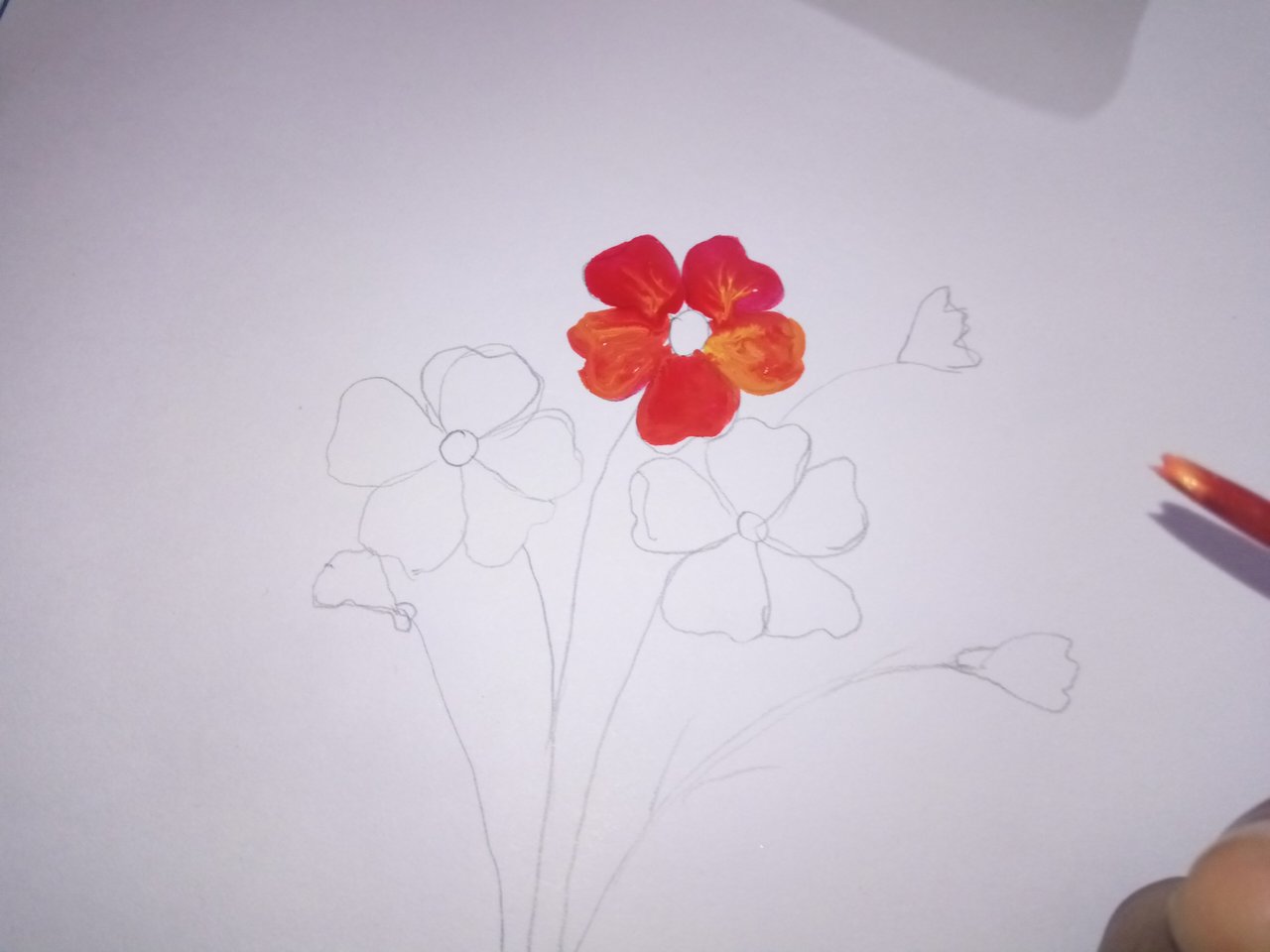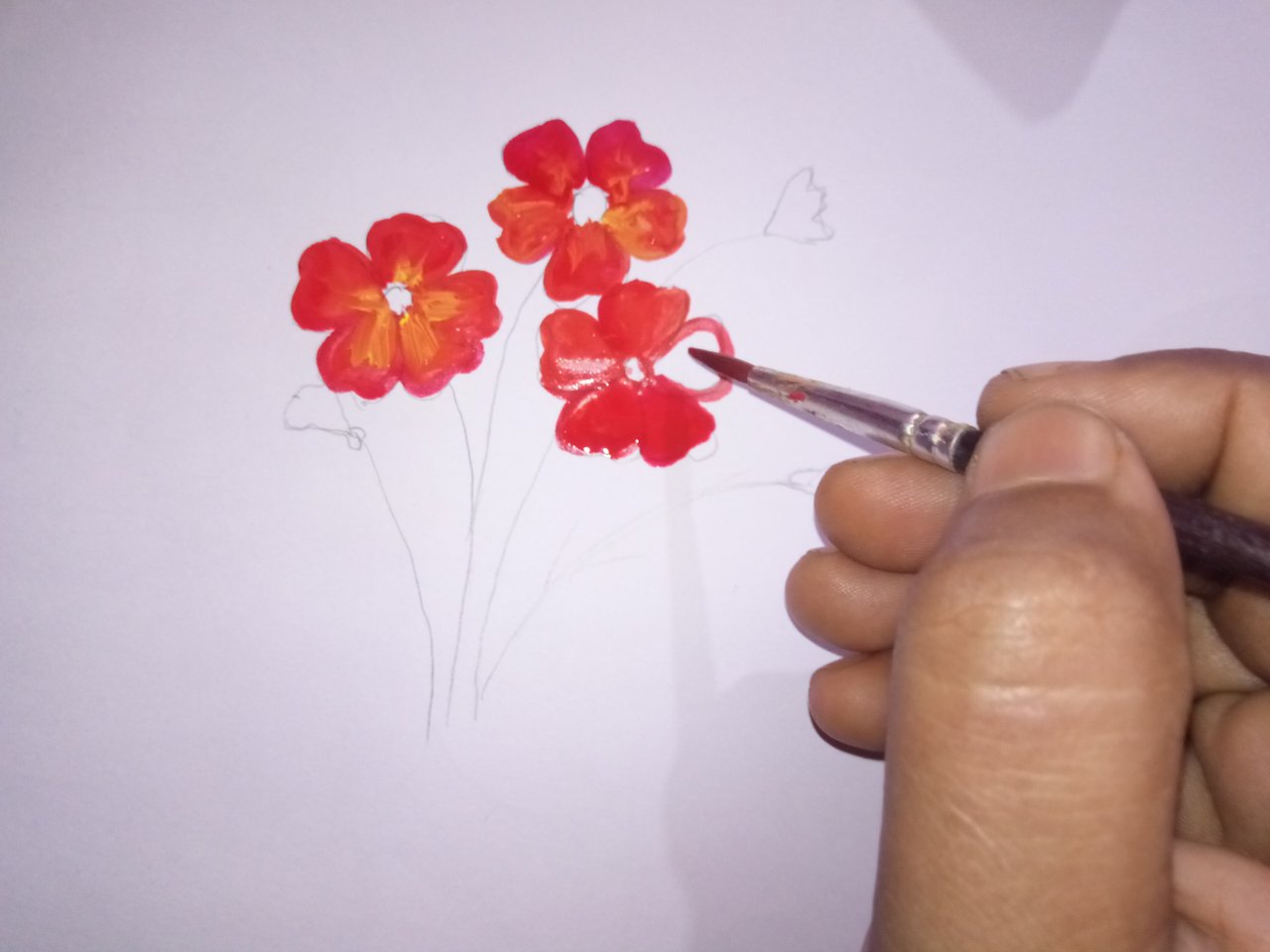 একটি ফুল লাল এবং হলুদ রং দিয়ে করার পর পাশের ফুলটিকে আবারো রং করা শুরু করলাম। এক্ষেত্রেও আমি লাল রং এবং হলুদ রং ব্যবহার করেছি। একটি একটি করে সবগুলো পাপড়ির রং করেই আমি এই ফুলটির রং করে নিলাম।
