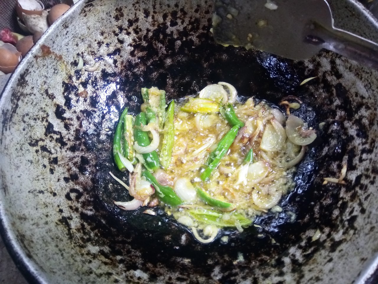 প্রথমত আমি কড়াইতে সরিষার তেল দিয়ে দিলাম। তেল গরম হয়ে এলে এরমধ্যে দিয়ে দিলাম পেয়াজকুচি আর কাচামরিচ ফালি।এগুলো দেয়ার পর কিছুক্ষণ ভাজতে থাকলাম৷