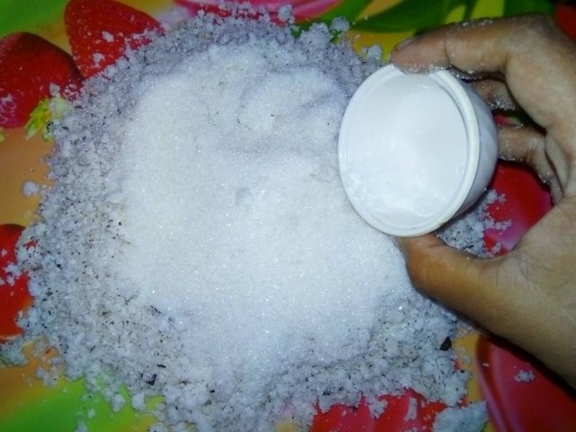 এরমধ্যে প্রথমত চিনি আর লবণ দিয়ে দিলাম। কারণ চিনি মেখে নেয়ার পর চিনির পানি বের হবে,তাই আগেই দিয়ে দিলাম।