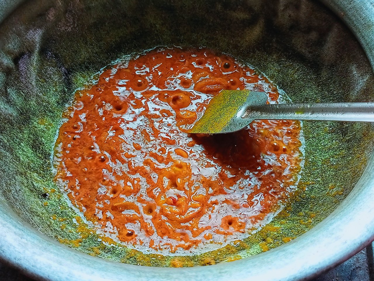 এবার শিমের বিচি এবং টমেটোগুলো কিছুক্ষণ মসলার মিশ্রণের সাথে নাড়াচাড়া করলাম। এরপর কিছুটা পানি দিয়ে সিদ্ধ বসিয়ে দিলাম।