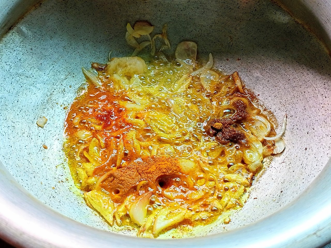 এবার ভাজা পেঁয়াজের মধ্যে হলুদ গুঁড়া, মরিচ গুঁড়া, রসুন বাটা এবং জিরা ধনিয়া গুড়া দিয়ে দিলাম। এবার বেশ কিছুটা সময় নিয়ে মশলা গুলো কষিয়ে নিলাম।