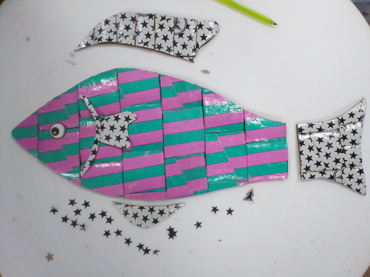 যেকোন কাজে দিকনির্দেশনা একটি বড় বিষয়। তাই একটি কার্ড বোর্ড কেটে মাছ এঁকে নিলাম এবং কাজের সুবিধার জন্য টুকরো করে নিলাম।