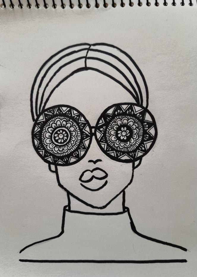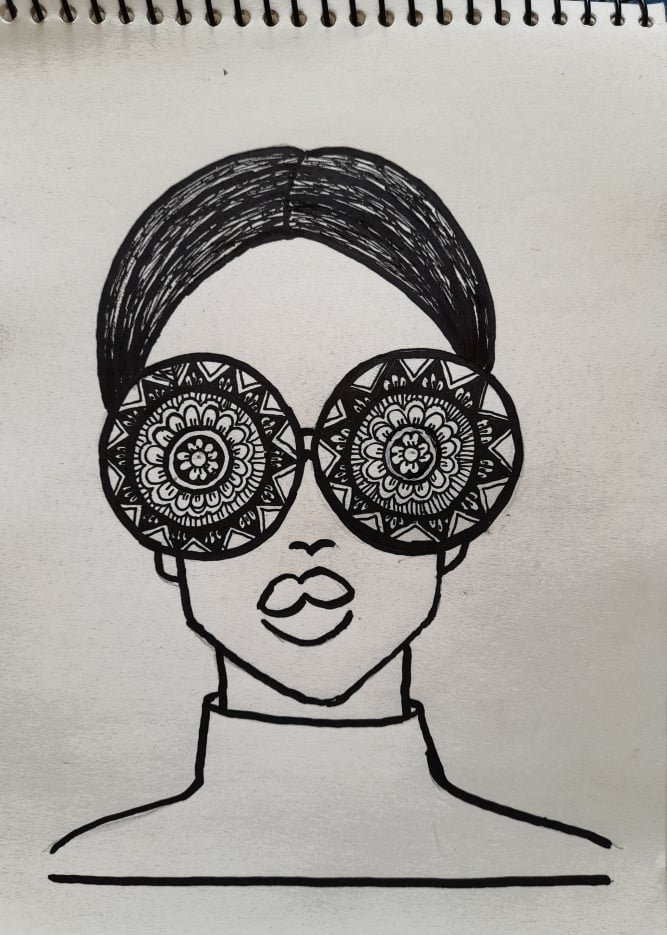 একটি মেয়ের মান্ডালা চশমা পরিধানকৃত চিত্রাংকন জাষ্ট দারুন দেখাচ্ছে।