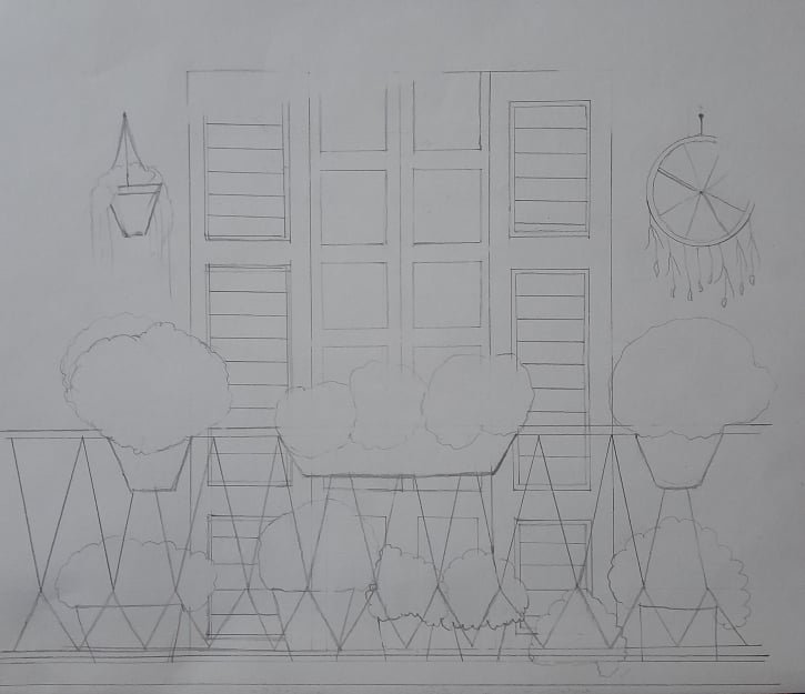 এরপর রেলিং এর উপরে এবং নিচে কয়েকটি গাছ অংকন করে নিলাম। এবং বেলকনির দেয়াল হিসেবে ব্যবহৃত জায়গাটিতে ঝুলন্ত একটি গাছ এবং আরেক পাশে একটি শোপিস অঙ্কন করে নিলাম।