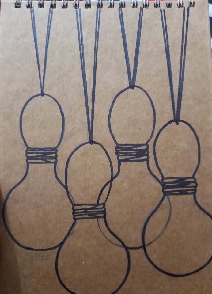 এরপর বাল্ব গুলো ঝুলানোর জন্য উপরের দিকে ভালোভাবে দড়ি অঙ্কন করে নিলাম। এবং সেইসাথে মার্কার পেন এর সাহায্যে পেন্সিল দ্বারা অঙ্কিত চিত্রাঙ্কনটি গাঢ় করে নিলাম।