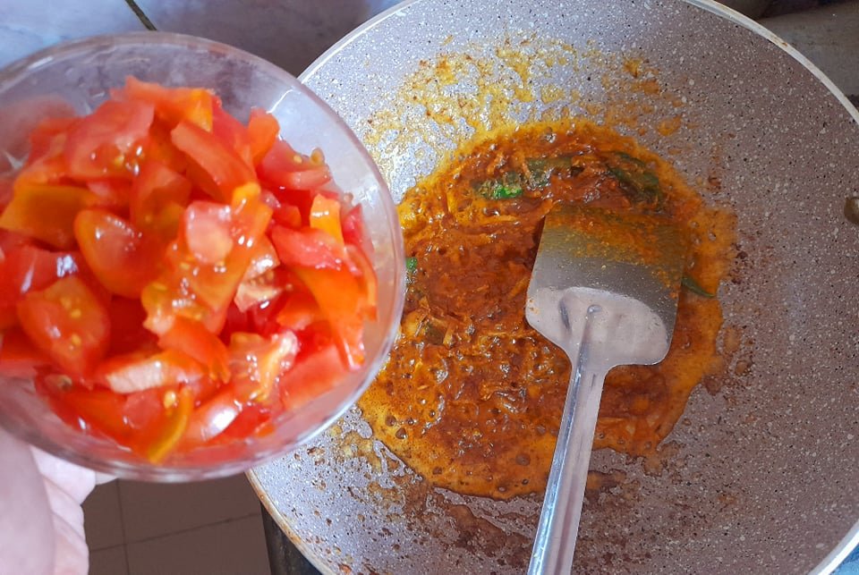 এরপর এরমধ্যে কুচানো টমেটো গুলো দিয়ে দিলাম। এবং টমেটো গুড়া মশলা গুলোর সাথে ভালোভাবে ভেজে নিলাম।