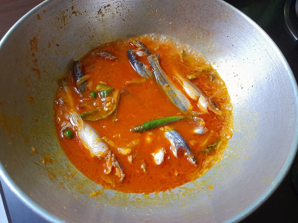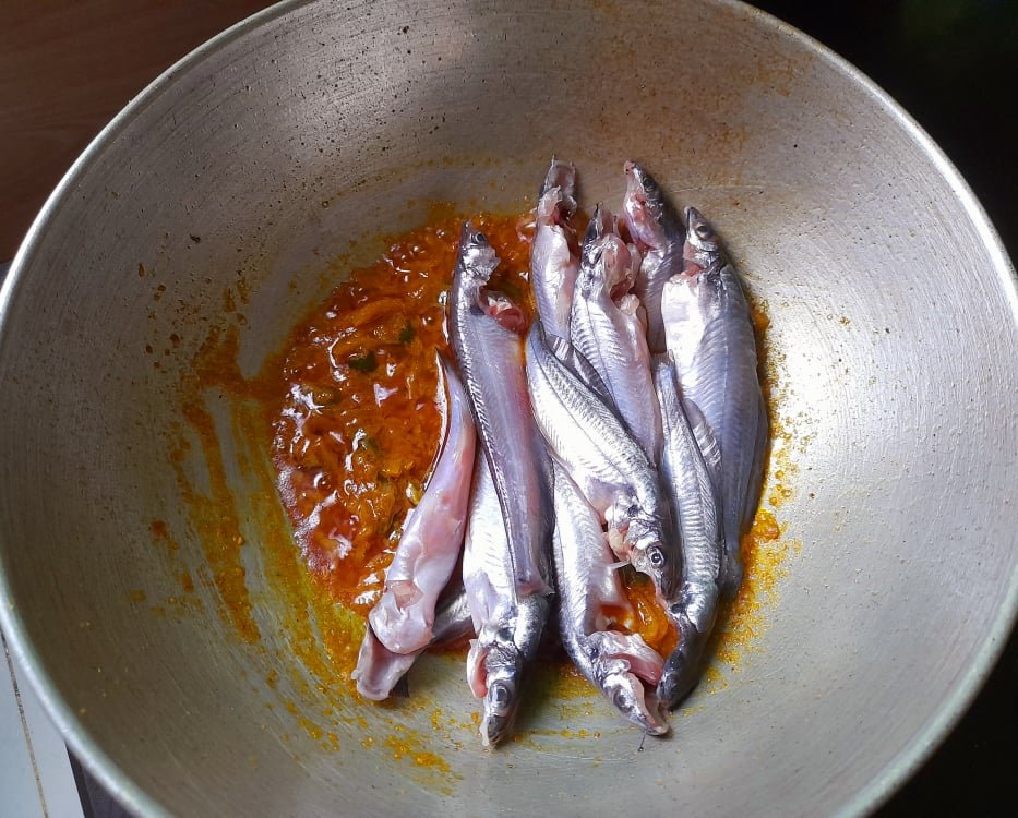 এরপর মসলার সাথে টেংরা মাছ গুলো ভালোভাবে ভেজে নিলাম। এরপর সামান্য পরিমাণে পানি দিয়ে মাছগুলো মশলার সাথে ভালোভাবে কষিয়ে নিলাম।