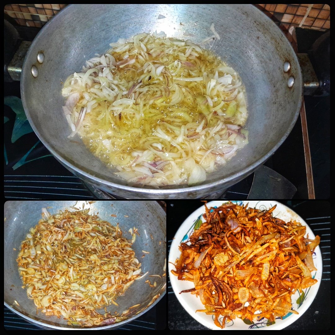 চিকেন ভেজে নিয়ে একই তেলে পেঁয়াজ বেরেস্তা করে নিয়েছি।