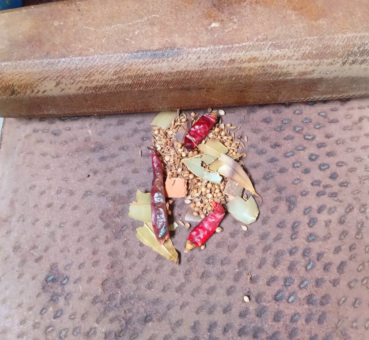 এরপর অন্য একটি পাতিলে তেজপাতা, দারচিনি, শুকনো মরিচ, ধনিয়া এবং জিরা দিয়ে দিয়েছি। এরপর সবকিছু মচমচে করে ভালোভাবে ভেজে নিতে হবে। তেজপাতা এবং দারচিনি টুকরো করে দিতে হবে যেন পরে গুঁড়ো করার ক্ষেত্রে সুবিধা হয়। মসলা গুলো ভাজা হয়ে গেলে শিল পাটায় গুঁড়ো করে নিব। খুব বেশি মিহি করে গুঁড়ো করা যাবে না। এটাই হচ্ছে এই চাটনির স্পেশাল মসলা।