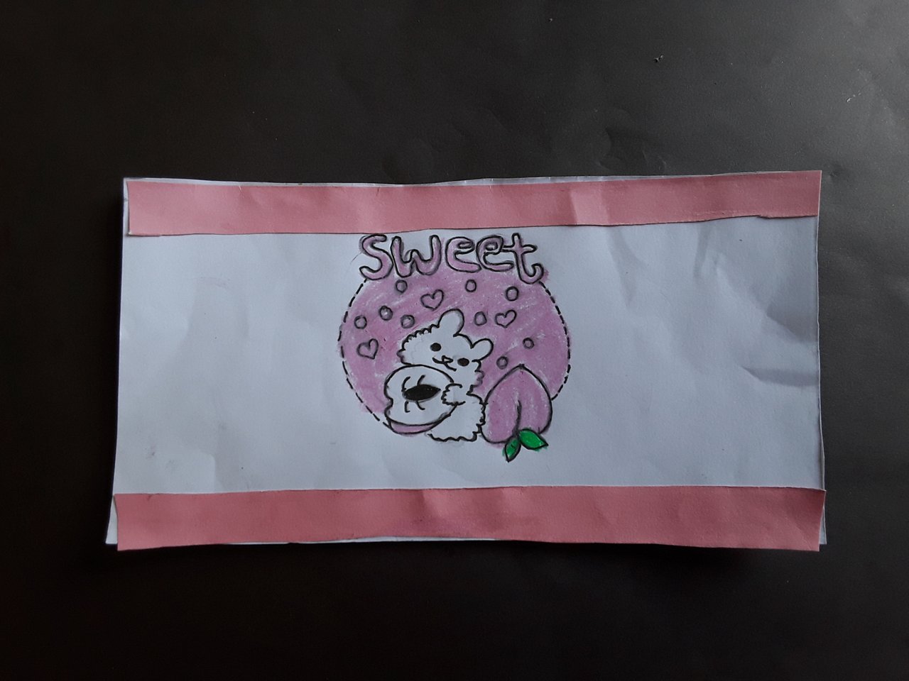 - প্রথমে আমি ১৪ সেন্টিমিটার প্রস্থ এবং ৭ সেন্টিমিটার দৈর্ঘ্য নিয়ে একটি কাগজ কেটে নিয়েছি। এরপর ওই কাগজটির দুই দিকে লাগানোর জন্য চিকন করে রঙিন কাগজ কেটে নিয়েছি। এরপর আমি সেখানে চকলেট এর প্যাকেটের উপর স্টিকার হিসেবে একটি ড্রইং অঙ্কন করে নিয়েছি।