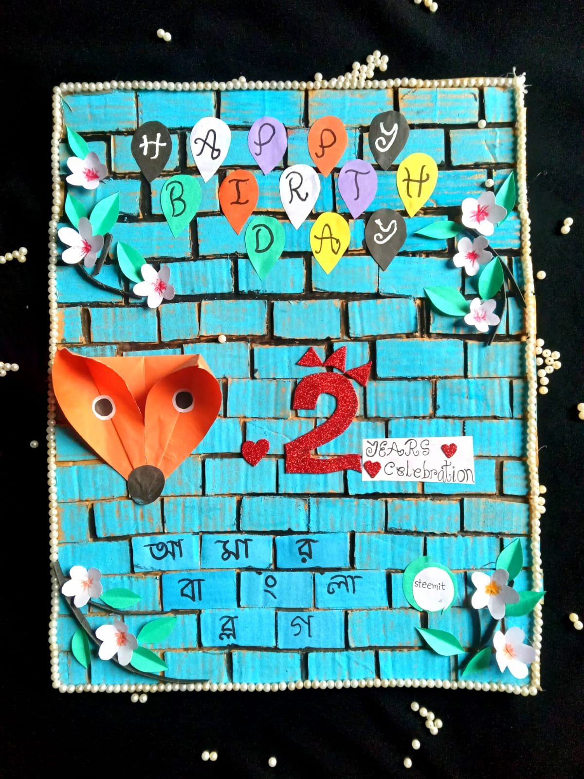 - এবার আমি কয়েকটি কালারের রঙিন কাগজ নিয়ে বেলুনে আবৃত্তি করে বেশ কিছু কেটে নিলাম। এরপর মার্কার পেন দিয়ে হ্যাপি বার্থডে পুরোটা ইংরেজি শব্দে একটা একটা করে লিখে নিলাম। তারপর রঙিন কাগজ দিয়ে একটি স্টিমের লোগো কেটে তৈরি করে নিলাম। তারপর সবগুলোকে সে বড় কাটনের বোর্ডটির মধ্যে ঘাম দিয়ে এক এক করে লাগিয়ে নিলাম।