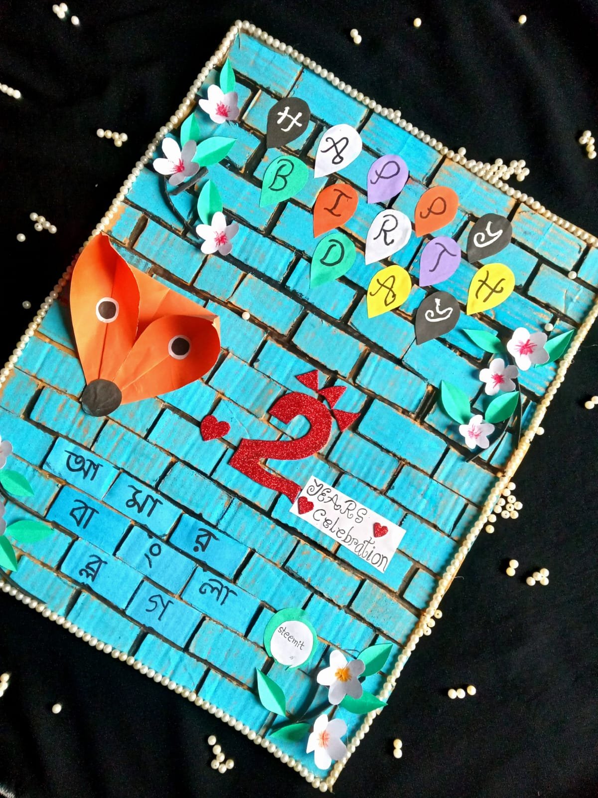 - তারপর আমি গ্লিটার আর্ট পেপার দিয়ে একটি দুই অংক মার্ক করে কেচি দিয়ে কেটে নিলাম। তারপর ছোট ছোট করে আরো দুটো লাভ চিহ্ন কেটে নিলাম। এবার সাদা কাগজের মধ্যে ইংরেজিতে ইয়ার সেলিব্রেশনটা কলম দিয়ে লিখে নিলাম। এরপর এগুলো রং করা বড় কাটন বোর্ডের মধ্যে ঘাম দিয়ে লাগিয়ে দিলাম।