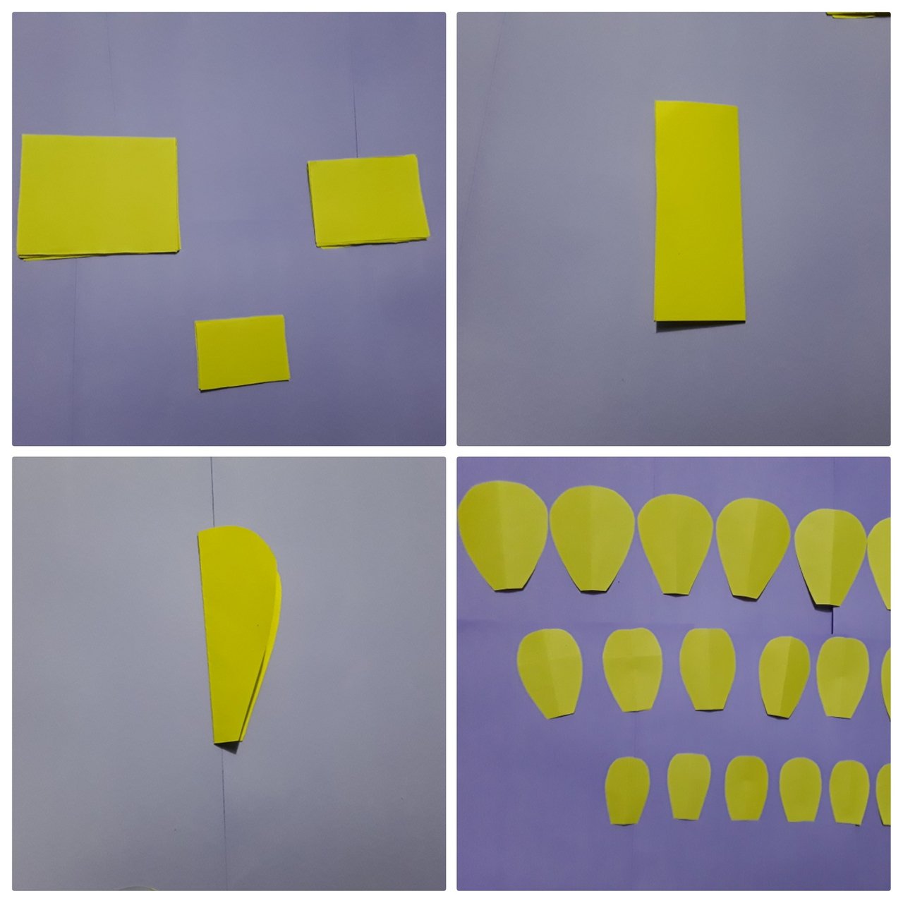 - প্রথমে আমি তিনটি মাপের কাগজ কেটে নিয়েছি। এবং প্রত্যেকটি মাপের কাগজে সাতটি করে মোট ২১ টি কাগজ কেটে নিয়েছি। এরপর কাগজের মাঝখান বরাবর একটি ভাগ দিয়ে নিয়েছি। ভাঁজ করার পর পাপড়ির মতো সাইজ করে কাগজ কেটে নিয়েছি। এরকম করে তিনটি সাইজের সবগুলো কাগজ কেটে নিতে হবে।